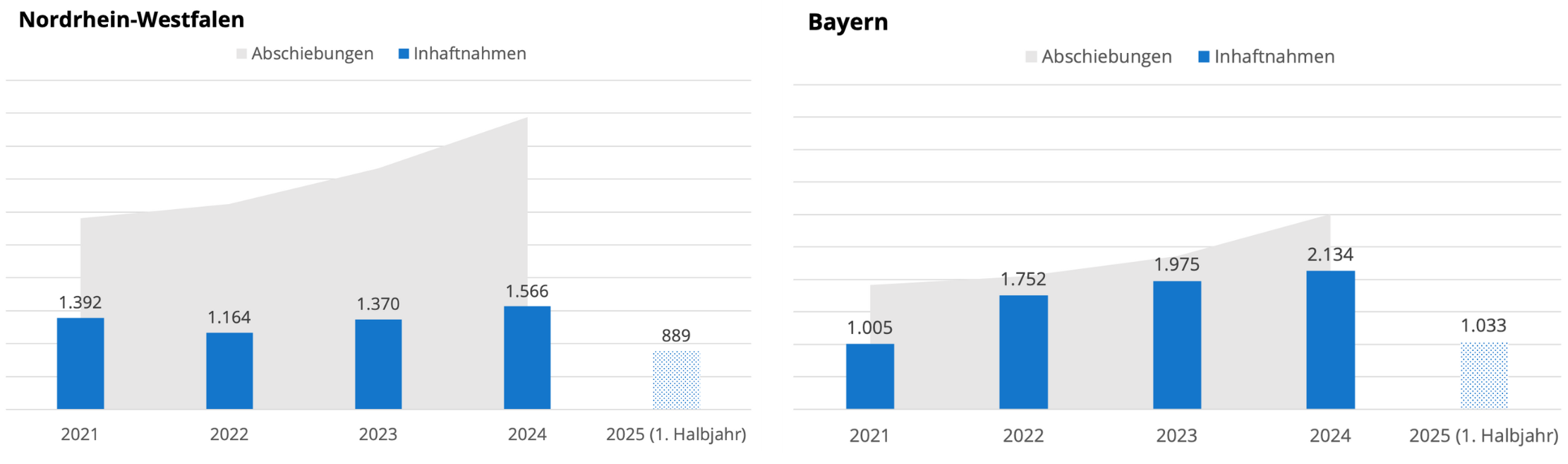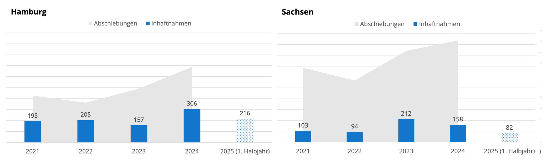 In Bayern stieg etwa die Zahl der Inhaftnahmen zwischen 2021 und 2022 um 74 Prozent, die Zahl der Abschiebungen um 7 Prozent. In Hamburg ging im selben Zeitraum die Zahl der Abschiebungen zurück – trotz mehr Inhaftnahmen. Die Zahl der Abschiebungen kann auch bei rückgängigen Inhaftnahmen steigen: So etwa in Nordrhein-Westfalen zwischen 2021 und 2022 (ca. 16 Prozent weniger Inhaftnahmen, sieben Prozent mehr Abschiebungen) – und in Sachsen zwischen 2023 und 2024 (25 Prozent weniger Inhaftnahmen, 11 Prozent mehr Abschiebungen).