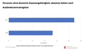 Im Verhältnis zu 1998 (als das neue Staatsbürgerschaftsrecht eingeführt wurde) ist die Zahl der ausländischen Staatsbürger*innen in Deutschland um etwa 60 Prozent gestiegen – von sieben auf rund elf Millionen Menschen. Mehr als 40 Prozent von ihnen leben seit mehr als zehn Jahren in Deutschland, wie der Professor für öffentliches Recht Tarik Tabbara in einer Analyse für den MEDIENDIENST festgestellt hat.