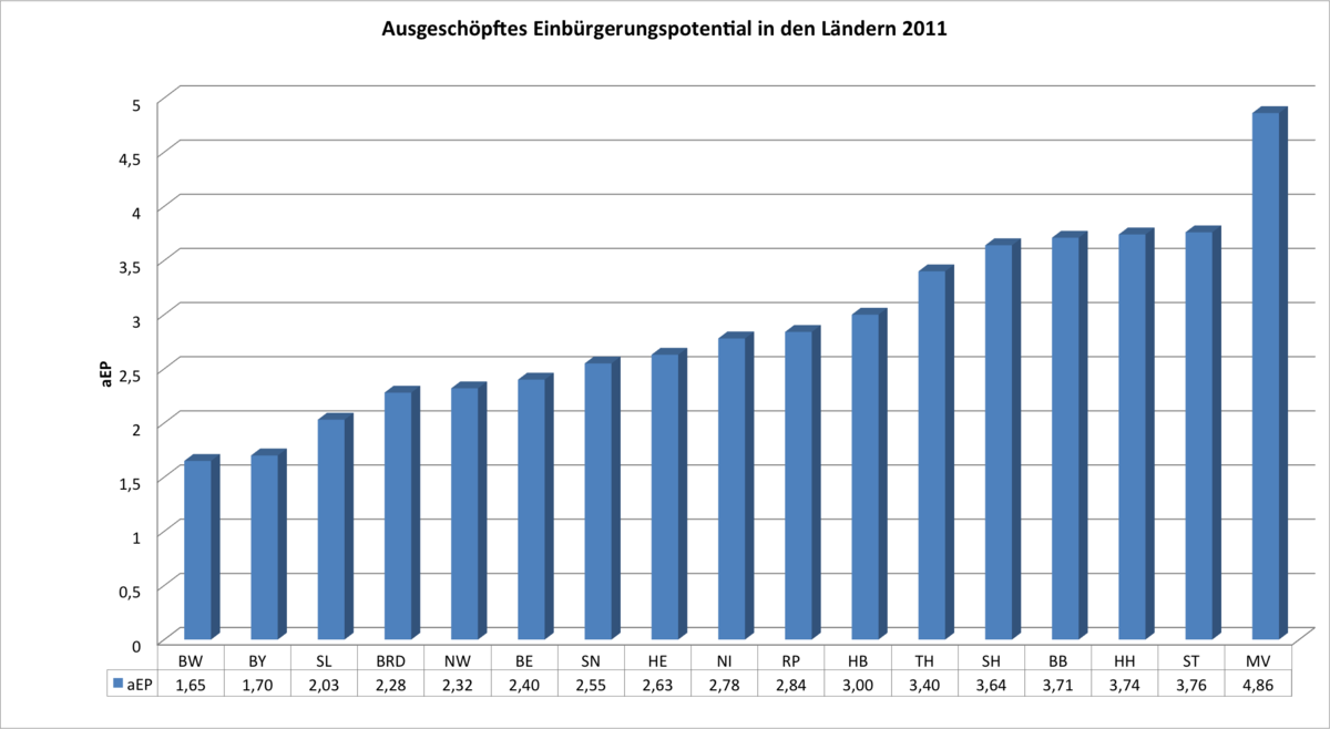 Von daher ist es interessant, die Umsetzung des Gesetzes in den Bundesländern zu beobachten. Als Vergleichswert wird nicht die tatsächliche Zahl der Eingebürgerungen herangezogen, sondern die sogenannte Einbürgerungsquote, die Aussage darüber gibt, inwiefern das Einbürgerungspotenzial ausgeschöpft wird. Berechnet wird sie in Prozent der Ausländer, die mehr als 10 Jahre in Deutschland leben und damit einbürgerungsberechtigt sind.