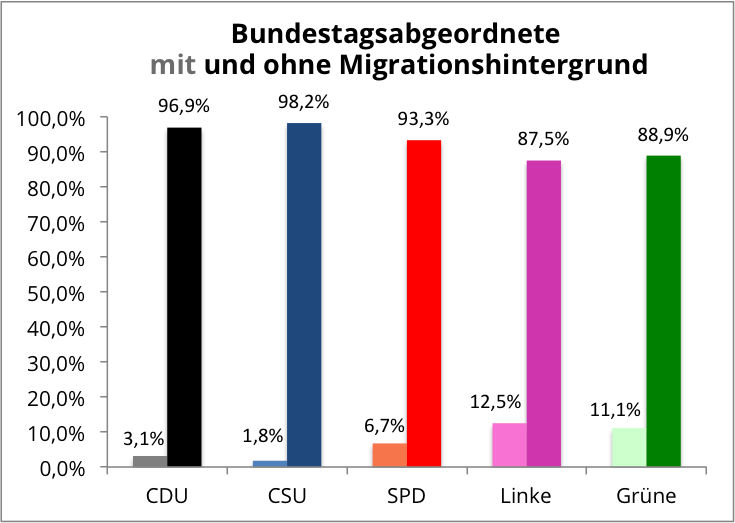 - mit 2,9 Prozent in der CDU/CSU-Fraktion sind hier anteilig die wenigsten Menschen mit Migrationshintergrund vertreten.