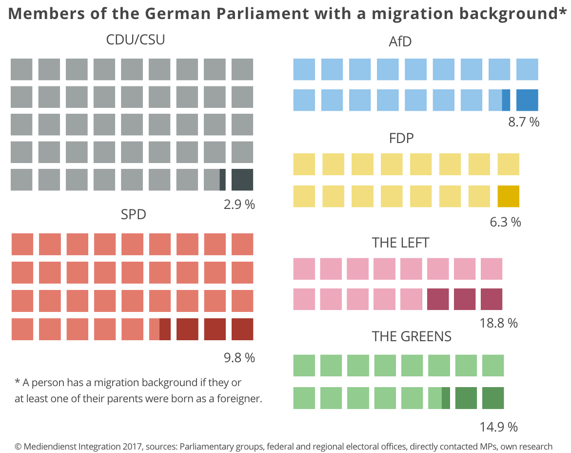 - The Greens(Die Grünen) have had a slight decrease of migrant MPs, from 14.9 per cent in 2017 to now 14.4per cent.