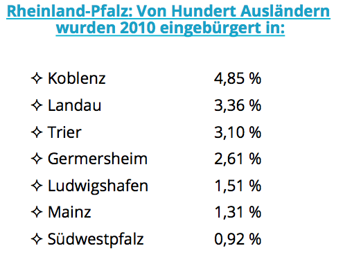 Ein positives Gegenbeispiel ist die Stadt Koblenz, wo 2010 und 2011 fast fünf Prozent der Ausländer eingebürgert wurden (vgl. Abb). Oberbürgermeister Hofmann-Göttig erklärt dazu in seinem "Tagebuch": "Ich stelle dabei heraus, dass das auch viel mit unserem friedlichen Integrationsklima in Koblenz zu tun hat." Es gebe einen Geist der Offenheit und Zusammenarbeit.