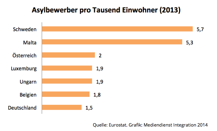 Der UNHCR meldete kürzlich in seinem Bericht „Asylum Trends in Industrialized Countries 2013“, dass Deutschland in diesem Jahr das Land war, in dem die meisten Menschen Asyl beantragten. Das Europäische Statistische Amt (EUROSTAT) bestätigt in einem Kurzbericht, dass die Bundesrepublik die USA als Spitzenreiter der industrialisierten Länder mit den meisten Asylanträgen ablöste. Mit rund 109.000 Erstanträgen auf Asyl nahm Deutschland demnach seit 1999 zum ersten Mal wieder die Spitzenreiterposition ein.