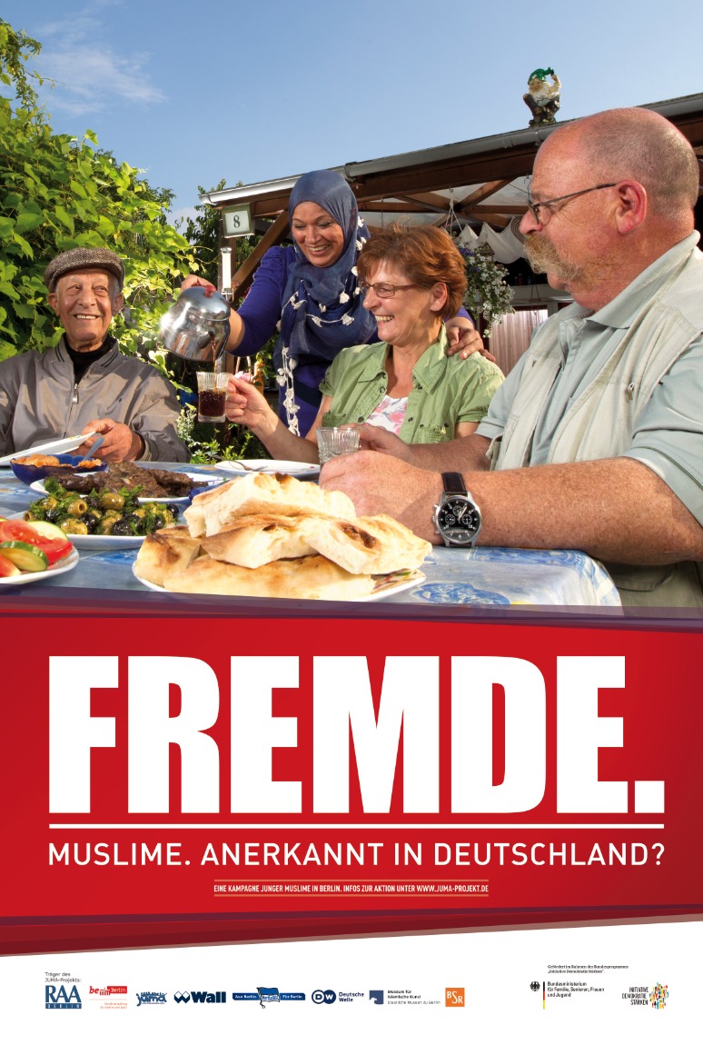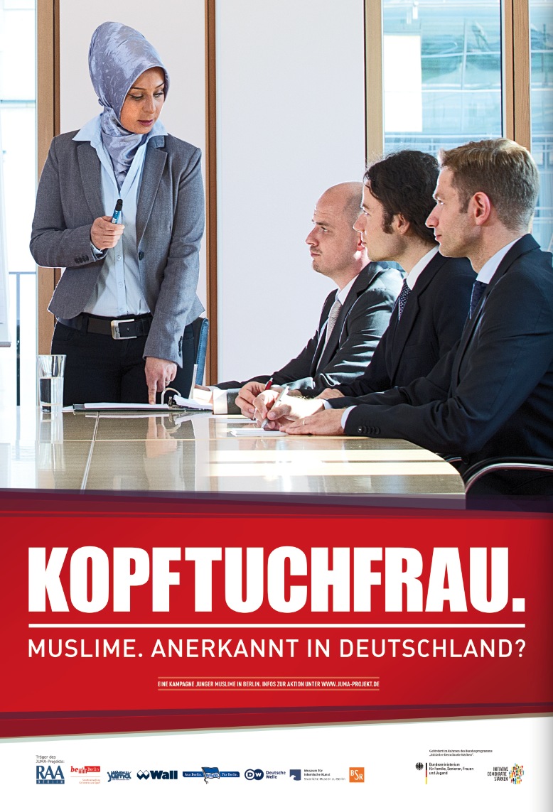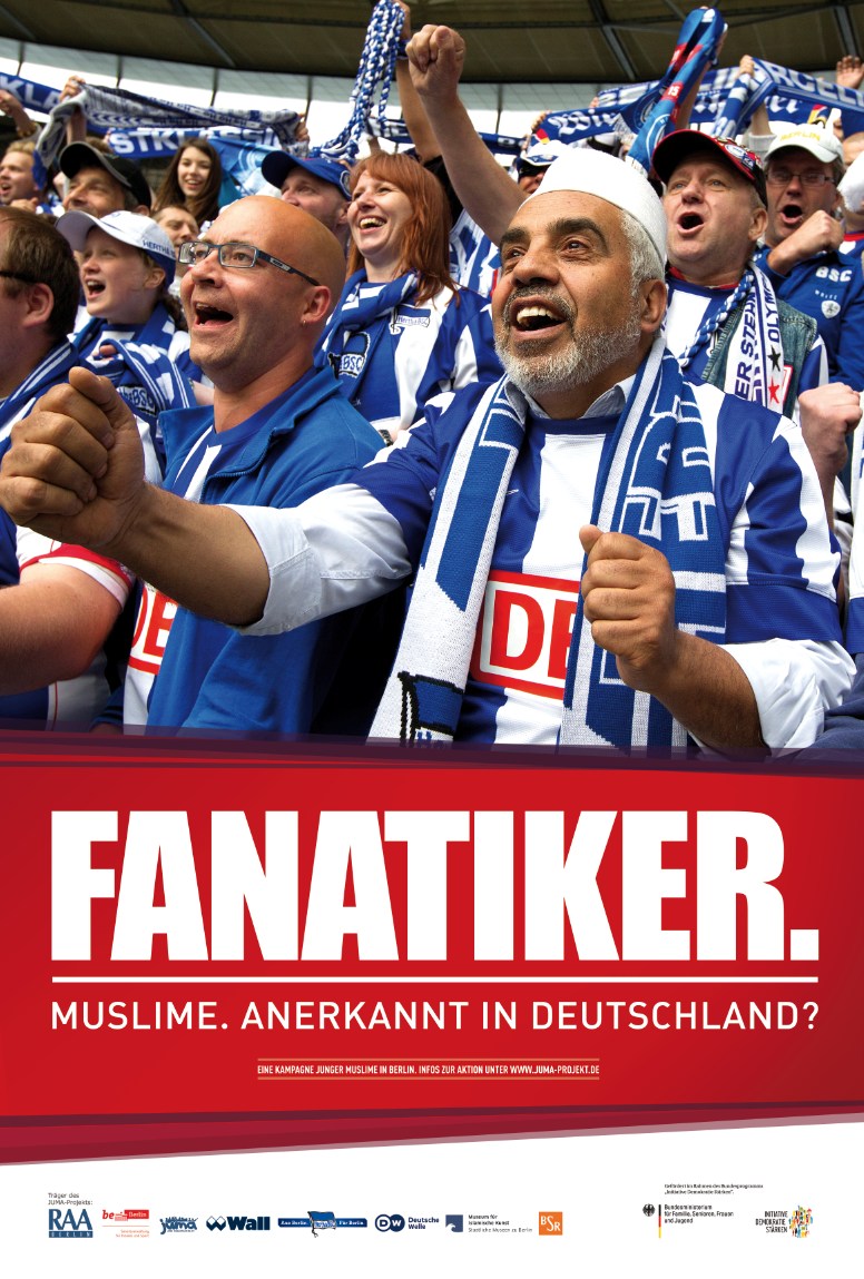 - Das Projekt "jung muslimisch aktiv" (juma) zeigt seit Anfang August an 500 Orten in Berlin Plakate, die mit den Stereotypen spielen: So sieht man beispielsweise eine Businessfrau mit Kopftuch, die vor ihren männlichen Kollegen spricht oder einen Imam als Hertha-Fan, der mit anderen seine Mannschaft anfeuert.