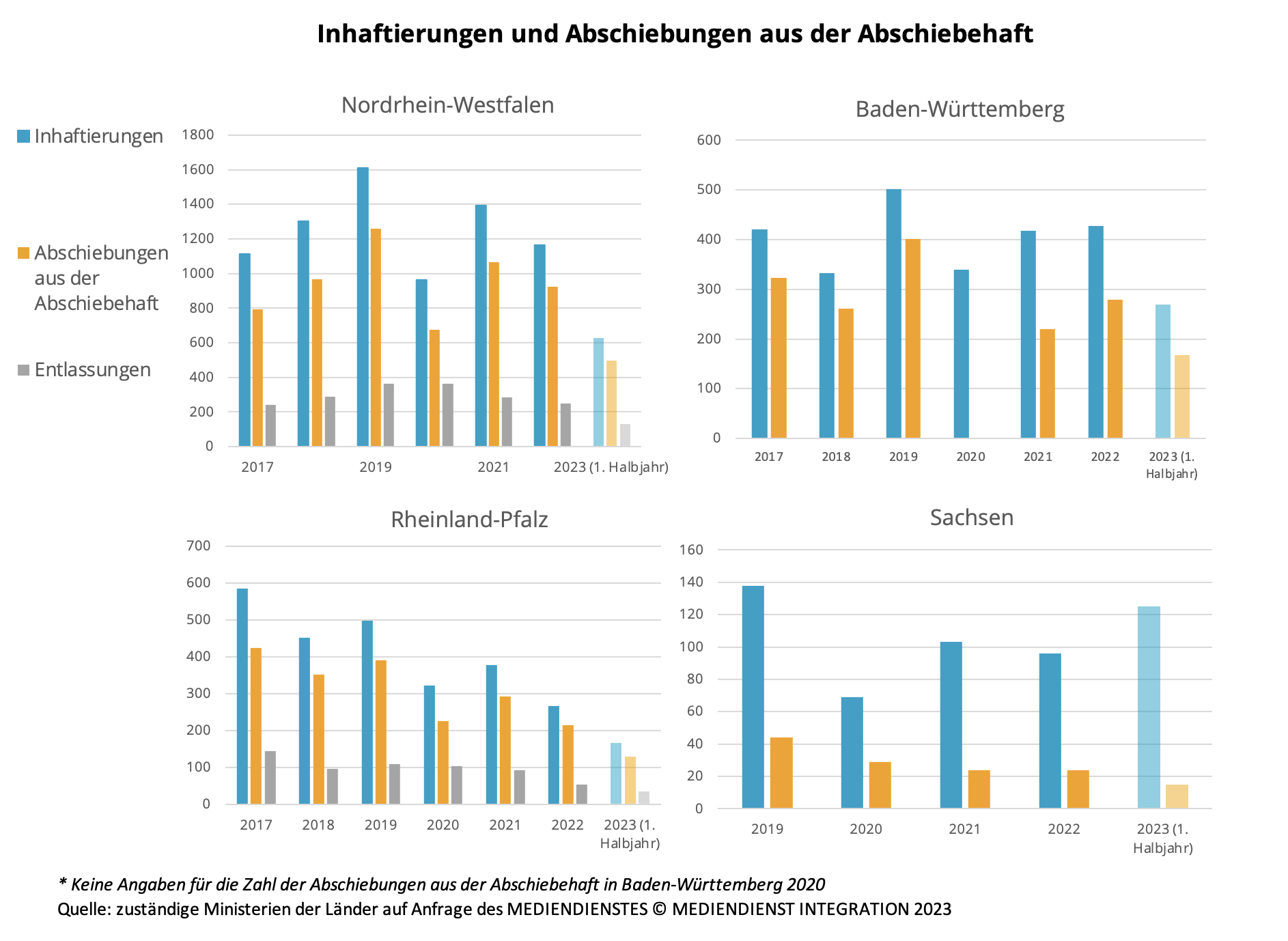 Ein Blick auf die Zahlen aus einigen Bundesländern, die über größere Hafteinrichtungen (40 Plätze oder mehr) verfügen, zeigt: Der Anteil der Personen, die aus der Abschiebungshaft abgeschoben werden, variiert sehr stark von Bundesland zu Bundesland. Während etwa in Nordrhein-Westfalen und Rheinland-Pfalz im ersten Halbjahr 2023 vier von fünf inhaftierten Personen abgeschoben wurden, war es in Sachsen eine von zehn Personen.