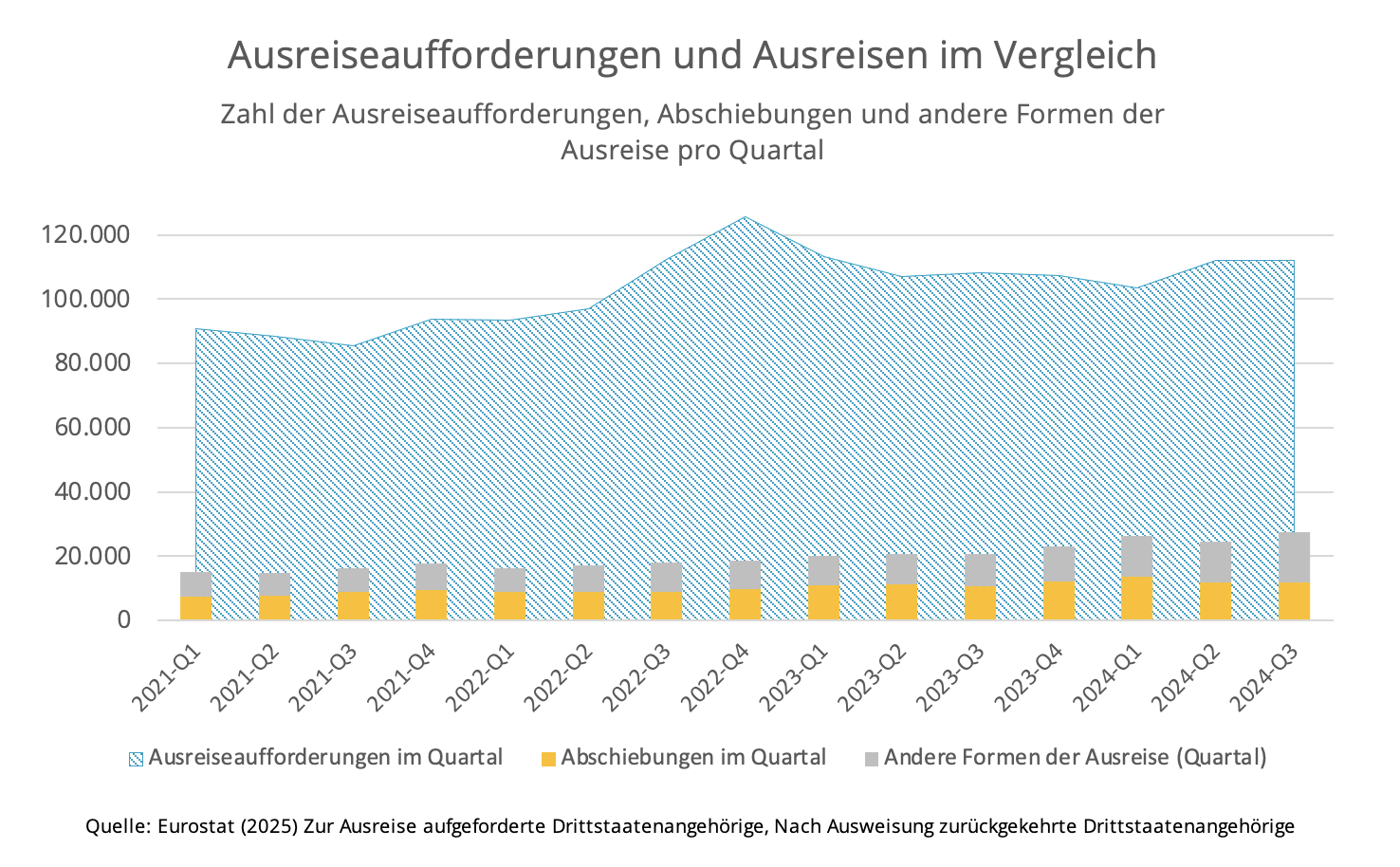 Zwischen Januar und September 2024 wurden Eurostat zufolge in der EU rund 328.000 Ausreiseaufforderungen (order to leave) erlassen. Das sind fast genauso viele wie im Vorjahreszeitraum. Die meisten Ausreiseaufforderungen gab es in Frankreich (ca. 96.400), Deutschland (41.900), Spanien (32.400), und Italien (20.500). Diese betrafen vor allem Personen aus Algerien (26.300), Marokko (23.500), der Türkei (19.000) und Syrien (18.400).Quelle